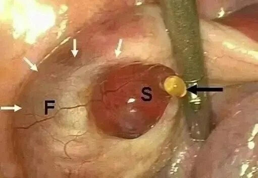 ▲ 说明:图中为放大的排卵过程,其中F为卵巢,S为卵泡