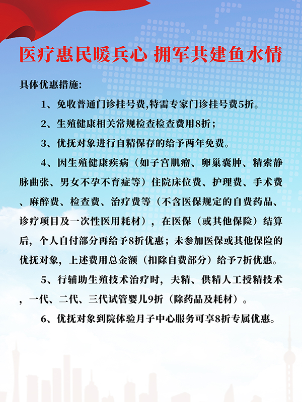 近年来,医院始终聚焦军人军属“急难愁盼”问题,依托自身生殖健康专科优势,在男科、辅助生殖诊疗、月子服务等领域提供多项减免和优待措施,制定了全方位、精细化的专属优抚服务方案,将“优先、优质、优惠”的服务承诺落到实处、融入细节。