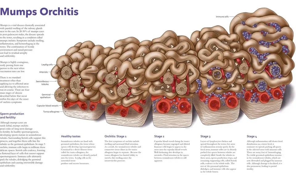 流行性腮腺炎病毒并不仅仅攻击唾液腺。在青春期后或成年男性感染时,病毒有高达20%~30%的几率会随血液侵袭至睾丸,引发病毒性睾丸炎。